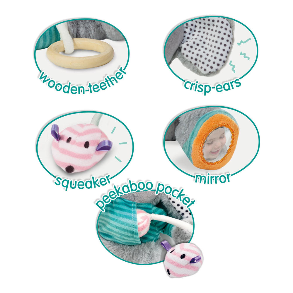 Olfi the big, soft and friendly elephant is much more than just a cuddly toy. He will introduce your little one to different textures, patterns and sounds. For example, the ears make a crackling sound, Olfi's foot is a mirror, there's a squeaky mouse hidden in his chest pocket. He also has a ring on his hand on which your little one can nibble or bite. Plenty of activities to discover!