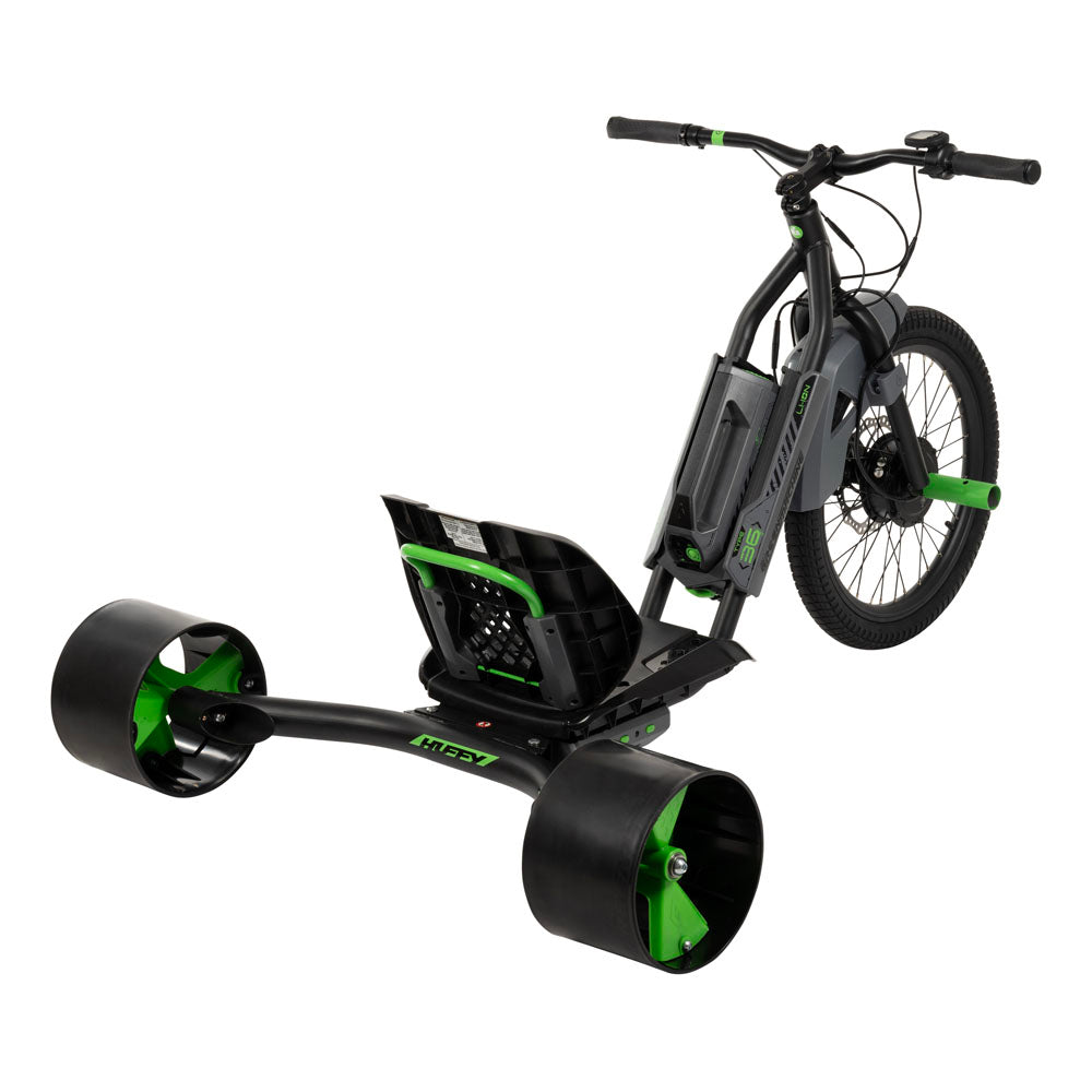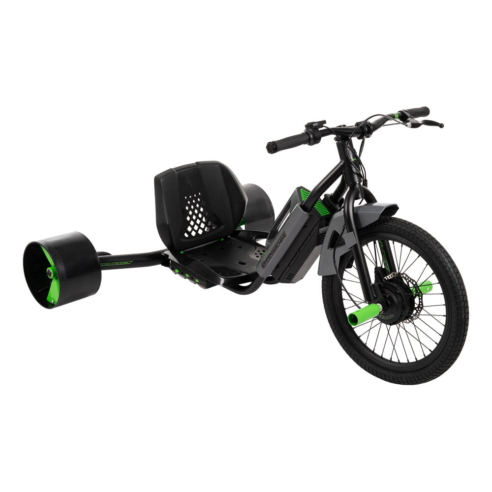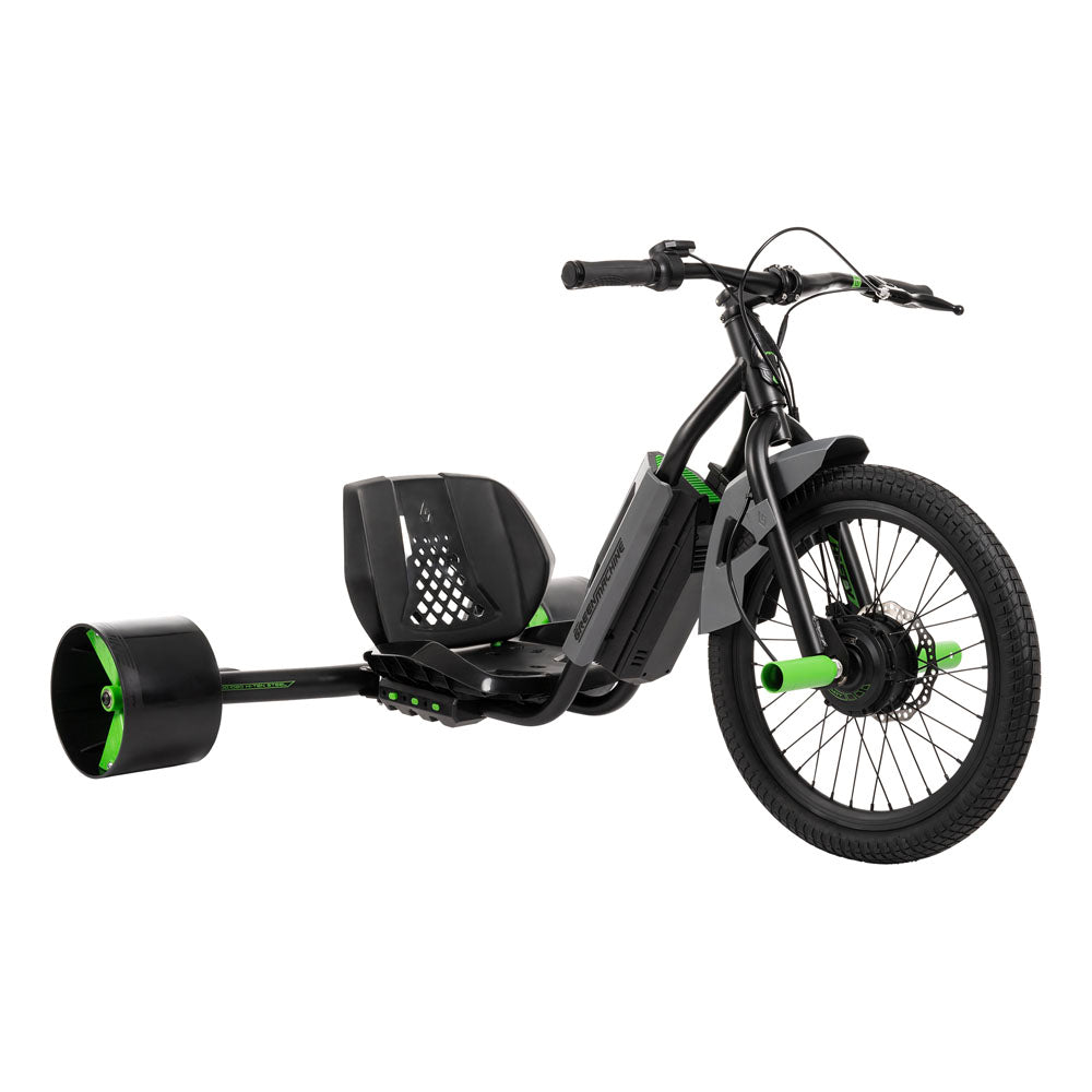 Ultimate thrills, drifts, and spins are yours on Huffy's all-new 36V Electric Green Machine!. Featuring a 36-Volt battery powering a 250-watt front hub motor, this thrilling electric drift trike reaches speeds up to 15 miles per hour!. Perfect for riders 14 and up, the Electric Green Machine reignites the thrill of childhood rides on the big wheel trike you know and love.